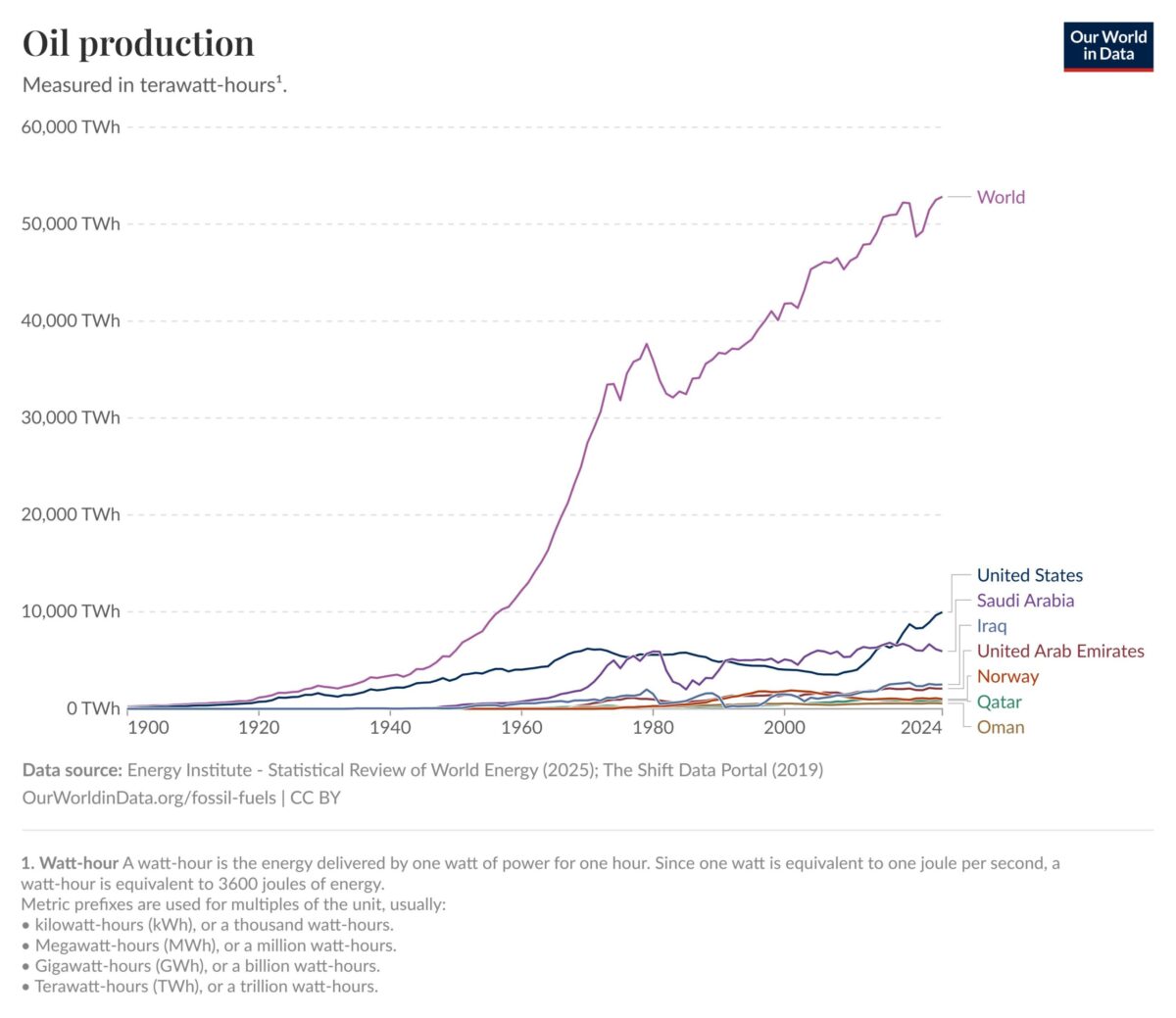 Fuente: Our World in Data, https://ourworldindata.org/grapher/oil-production-by-country?country=QAT~OMN~SAU~NOR~IRQ~USA~ARE~OWID_WRL.
