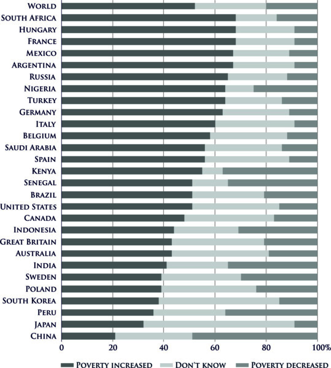 El mayor temor de todos es la creencia de que el mundo va por mal camino y que el pasado fue mejor que el presente. En una encuesta internacional realizada por Ipsos en 2017, el 52% de los encuestados creía que el nivel de pobreza en el mundo había aumentado en los últimos 20 años. Solo el 20 % opinaba lo contrario, es decir, lo correcto. En solo uno de los casi 30 países encuestados, China, más personas creían que la situación mundial estaba mejorando en lugar de empeorando. Sin embargo, independientemente de los indicadores que utilicemos para medir el nivel de vida mundial, podemos demostrar fácilmente que la humanidad vive cada vez mejor.