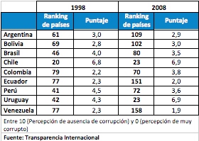 Como ha denunciado Transparencia Venezuela, la filial de la organización internacional Transparencia Internacional (TI), la percepción que tienen los venezolanos sobre la corrupción ha empeorado. Desde la llegada al poder de Chávez el Índice de Percepción de la Corrupción (IPC) de Transparencia Internacional no ha logrado alcanzar una puntuación igual o superior a 3 (Cuadro N° 2), cuando 10 es percepción de ausencia de corrupción.