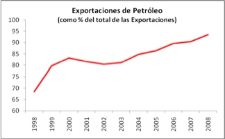 Como lo demuestra el cuadro N° 8, en la última década la especialización petrolera se ha hecho extrema, ha pasado a ser casi una dependencia total. En el año 2008 las exportaciones de esta materia prima representaron el 95% del total de las exportaciones de Venezuela. Esto último fue impulsado por la fuerte alza que experimentaron los precios internacionales del petróleo.
