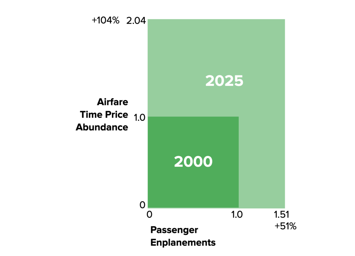 La Oficina de Estadísticas Laborales realiza un seguimiento de las tarifas aéreas, mientras que el Departamento de Transporte supervisa los embarques (pasajeros que suben a bordo). Desde el año 2000, la población de Estados Unidos creció un 22%, mientras que los embarques aumentaron un 51% y el precio del tiempo de las tarifas aéreas para los trabajadores manuales disminuyó un 49%. Esto significa que, en 2025, estos trabajadores obtienen 2,04 tarifas aéreas por el mismo tiempo que les llevó ganar el dinero para comprar una tarifa aérea en 2000, lo que indica un aumento de la abundancia del 104%. Cada aumento del 1% en la población se correspondió con un aumento del 4,73% en la abundancia de tarifas aéreas personales (104 ÷ 22).